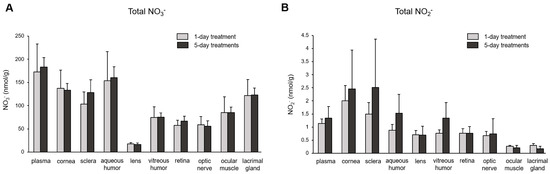 Total nitrate and nitrite concentration in porcine plasma and ocular tissues after supplementing Na15NO3 for five consecutive days. (A,B) Ocular tissues and plasma were collected from 1-day- and 5-day-treated animals and were prepared for nitrate and nitrite analysis with a standard chemiluminescence method [38]. Data are plotted as average ± standard deviation (n = 4). N represents an individual animal.
