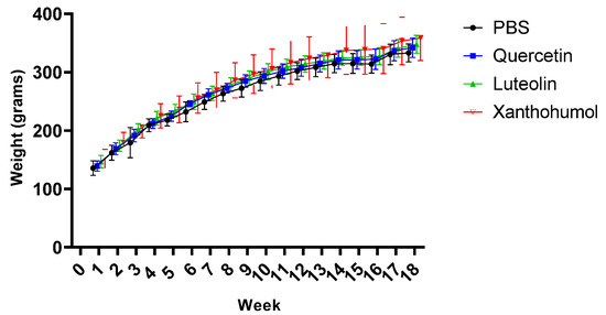 Cohort 1 was injected intraperitoneally with 200 µL of phosphate buffered saline (PBS) (VWR International, Radnor, PA, USA) as control. Cohort 2 was injected with 25 mg per kg body weight (mg/kg/bw) of quercetin (Apollo Scientific, Bredbury, UK). Cohort 3 was injected with 25 mg/kg/bw of luteolin (Fluorochem, Hadfield, UK). Cohort 4 was injected with 25 mg/kg/bw of xanthohumol. All the flavonoids were dissolved in PBS and injected into the animals 3 days a week during the 18 weeks of the experiment.