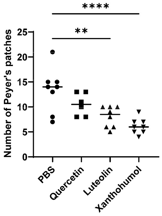 3.2. Effect of Quercetin, Luteolin, and Xanthohumol Administration on Hyperplastic Peyer’s Patches