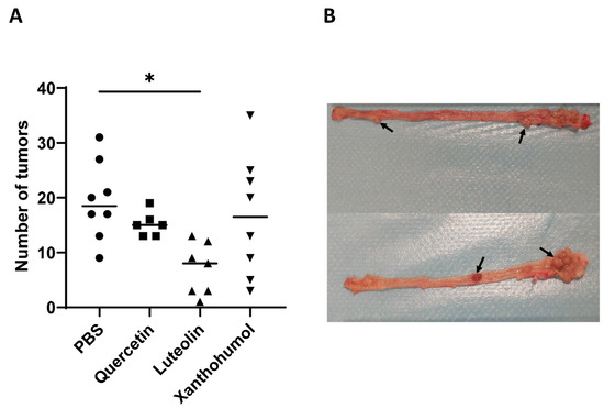 At the colon level, no significant differences were found in terms of their lengths (Figure S2). In contrast, the number of colon tumors showed a significant decrease in the luteolin cohort (average of 7 tumors) when compared to the PBS control cohort (average of 19 tumors) (Figure 3), demonstrating the antitumor potential of luteolin when administered intraperitoneally at the tested dose (25 mg/kg/bw). These results are in accordance with another study carried out in mice to which luteolin was administered intraperitoneally in AOM-induced animals, where the average number of tumors was reduced from 9.4 in the control cohort to 4.2 in the group that received luteolin [51]. In vitro, luteolin has shown high antitumor activity against the human CRC cell lines HCT116, HT-29, and T84, even with a synergistic effect when administered together with the commercial antitumor 5-FU [35]