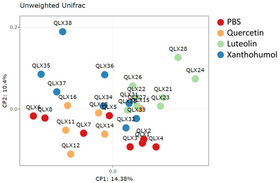 PCoA plot showing structural variations within microbial communities measured using the unweighted Unifrac beta diversity index. Each dot labeled with “QLX” and a numerical identifier indicates an individual participant in the experiment. Specifically, red dots represent CRC-induced animals in the PBS-treated cohort, orange dots belong to CRC-induced quercetin-treated animals, green dots correspond to CRC-induced luteolin-treated animals, and blue dots represent CRC-induced individuals of the xanthohumol-treated cohort.
