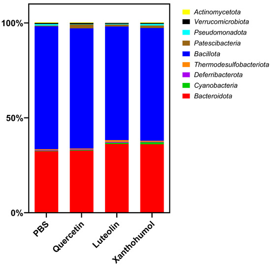 The quercetin cohort showed a statistically significant increase compared to the PBS cohort in the abundance of the phylum Patescibacteria (0.35% vs. 2.06% in the PBS cohort, p-value 0.00581) and a significant decrease in the phylum Pseudomonadota (0.80% vs. 0.15% in the PBS cohort, p-value 0.00913). In the case of the luteolin cohort, compared to the PBS cohort, notable variations were observed between different phyla. Specifically, the phyla Actinomycetota and Bacillota experienced reductions after luteolin treatment (0.33% vs. 0.10% in the luteolin cohort and 64.78% vs. 59.87% in the luteolin cohort, respectively) with associated p-values of 0.0001 and 0.02865, respectively. In contrast, the abundance of the phylum Bacteroidota exceeded that of the PBS cohort (31.01% vs. 36.08% in the luteolin cohort (p-value 0.00179). Finally, the xanthohumol cohort demonstrated an increase in the average percentage of the phyla Bacteroidota (32.01% in the PBS cohort vs. 35.80%), Cyanobacteria (0.27% in the PBS cohort vs. 1.06%), and Patescibacteria (0.35% in the PBS cohort vs. 1.28%), with associated p-values of 0.00415, 0.00167, and 0.04696, respectively. On the contrary, the percentage of the phylum Bacillota decreased from 64.78% in the PBS cohort to 59.41% in the xanthohumol cohort (p-value 0.01227). These variations are graphically represented in Figure 5.