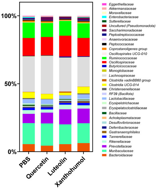 Significant differences were identified between PBS and quercetin cohorts in the families Saccharimonadaceae, which presented an increase from 0.35% to 2.06%, and Enterobacteriaceae, which decreased from 0.69% to 0.07%. The most pronounced disparities were observed between the PBS cohort and the luteolin cohort, where a significant decrease was observed in the families Eggerthellaceae (0.24% vs. 0.05%), Erysipelotrichaceae (0.82% vs. 0.13%), Christensenellaceae (0.77 vs. 0.09%), and Anaerovoracaceae (0.26% vs. 0.10%). On the contrary, an increase was observed in the families Clostridia vadinBB60 group (0.19% vs. 0.88%) and Butyricicoccaceae (0.23% vs. 0.61%).