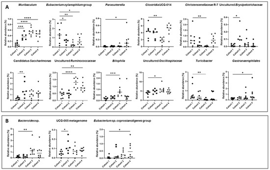 (A) Significant taxonomic variations at the genus level observed between rats with CRC-induced within the PBS cohort (Cohort 1) and the cohorts subjected to treatment with quercetin, luteolin, or xanthohumol (Cohorts 2, 3, and 4, respectively). (B) Significant taxonomic differences at the species level observed between rats with CRC induced within the PBS cohort (Cohort 1) and the cohorts subjected to treatment with quercetin, luteolin, or xanthohumol (Cohorts 2, 3, and 4, respectively). The median value of each cohort is represented as a horizontal line within each cohort. Asterisks indicate statistically significant differences (* p < 0.05; ** p < 0.005; *** p < 0.0005; **** p < 0.0001) (ANOVA test).