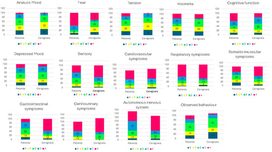 The analysis of the single items of the HAM-A scale in patients and caregivers revealed the following (Figure 2):