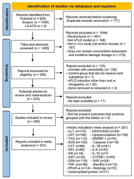 Initially, our search found 1348 articles in Scopus, 829 in Pubmed, and none in LILACS. Of these files, 777 were duplicates and were excluded. Therefore, 1400 records were filtered based on title and abstract. Files were excluded when they were reviews, book chapters, or event abstracts (n = 491); were not an AFLD model (n = 148); did not contain an in vivo study with rats and/or mice (n = 187); or did not contain antioxidant dosing concomitant with oxidative damage (n = 218). The full texts of 356 of these records were retrieved for further assessment. After the full texts were read, 133 articles were excluded because the animals had some type of comorbidity (n = 100); the control group received a substance that was not inert (n = 7); AFLD was induced by techniques other than orally or intragastrically (e.g., received ethanol intraperitoneally) (n = 23); and articles that were removed or portrayed in a newspaper (n = 3). After this analysis, 223 articles were potentially eligible for the review; however, 17 were excluded owing to missing data. Therefore, 206 files [10,11,12,13,14,15,16,17,18,19,20,21,22,23,24,25,26,27,28,29,30,31,32,33,34,35,36,37,38,39,40,41,42,43,44,45,46,47,48,49,50,51,52,53,54,55,56,57,58,59,60,61,62,63,64,65,66,67,68,69,70,71,72,73,74,75,76,77,78,79,80,81,82,83,84,85,86,87,88,89,90,91,92,93,94,95,96,97,98,99,100,101,102,103,104,105,106,107,108,109,110,111,112,113,114,115,116,117,118,119,120,121,122,123,124,125,126,127,128,129,130,131,132,133,134,135,136,137,138,139,140,141,142,143,144,145,146,147,148,149,150,151,152,153,154,155,156,157,158,159,160,161,162,163,164,165,166,167,168,169,170,171,172,173,174,175,176,177,178,179,180,181,182,183,184,185,186,187,188,189,190,191,192,193,194,195,196,197,198,199,200,201,202,203,204,205,206,207,208,209,210,211,212,213,214,215] entered the systematic review, but 5 did not present outcomes that could be grouped with the others and were excluded from the meta-analysis. Figure 1 summarizes the entire selection process of articles that fit into this systematic review and meta-analysis.