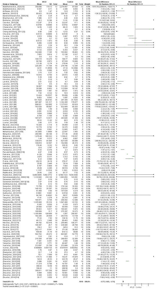 Liver SOD activity (U/mg) in animals was measured in 120 studies, which demonstrated a significant decrease in AFLD groups compared with control groups (MD of −1.77; 95% CI −1.83, −1.71; p < 0.00001), with statistically significant heterogeneity (p < 0.00001, I2 = 88%) (Figure 2).
