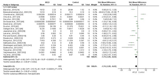 Analysis of GST activity was performed in 20 studies, which mainly used the measurements units U/mg (n = 10) and µol/mg (n = 10). There was a reduction in GST activity in AFLD groups compared with control groups (SMD: −1.74; 95% Cl −2.85, −0.63, p = 0.002). The studies showed high heterogeneity, with I2 = 91% (Figure 6).
