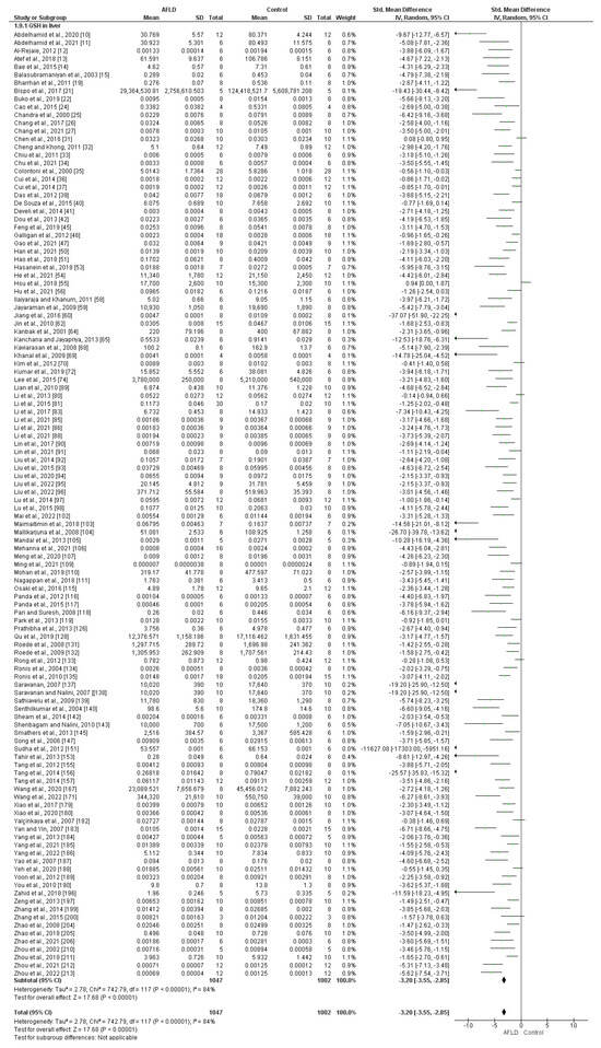 A total of 34 eligible studies quantified GR activity (22 measured in U/mg and 12 in µmol/mg/min). High heterogeneity was evident among the studies, with I2 values of 87%. The results also showed a reduction in GR activity in AFLD groups compared with control groups (SMD: −2.87, 95% Cl −3.58, −2.16) (Figure 5).