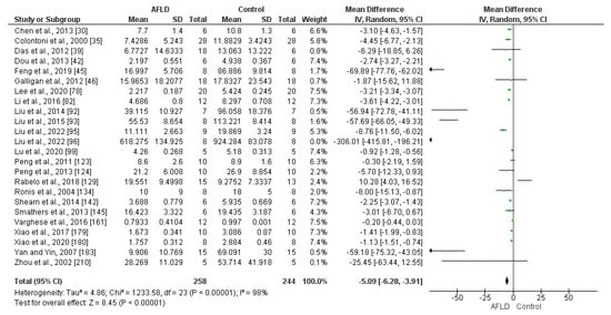 The sample size and mean ± standard deviation data extracted from the primary studies were plotted using the Review Manager (RevMan 5.3) software to generate the effective size. The random model was applied to estimate the pooled effects, the 95% confidence interval (95% CI) was used, and a p-value of <0.05 was considered statistically significant. The statistical heterogeneity among the studies was assessed using I2 statistics, and values of 25%, 50%, and 75% indicate low, moderate, and high heterogeneity, respectively. Assuming that there was some heterogeneity, subgroup analyses were carried out in categories (e.g.: liver × serum; mg/dL × mg/g). The standard mean difference (SMD) and in some cases, the mean difference (MD) were adopted. For analyses where there were more than 10 studies, funnel plots were produced.