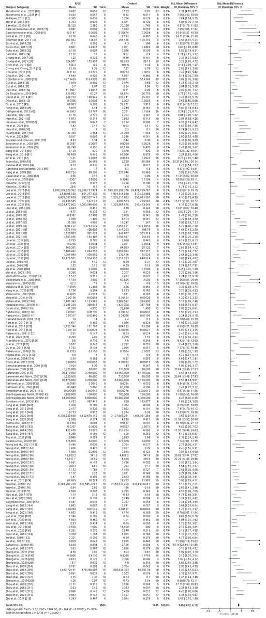 A total of 175 manuscripts evaluated the activity of ALT in serum/plasma (U/L). It is possible to observe through the SMD that there is an increase in the activity of this enzyme in AFLD groups compared with control groups (SMD: 3.51, 95% CI 3.21, 3.81, p < 0.00001). There was also high heterogeneity among the studies (I2 = 84%) (Supplementary Figure S1). With regard to AST, a total of 156 articles were included in the analysis, and these articles were heterogeneous among themselves (I2 = 85%). Similarly, an increase in AST activity was observed in AFLD groups compared with control groups (SMD: 3.56, 95% CI 3.24, 3.89, p < 0.00001) (Supplementary Figure S2).
