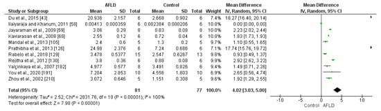 Typically, ALT (alanine aminotransferase) and AST (aspartate aminotransferase) are present in the liver and are involved in protein metabolism, so there are low levels in the bloodstream. However, when there is liver damage, these enzymes commonly leak into the bloodstream and lead to an increase in their quantification in serum/plasma. Thus, measuring this activity is a good tool for understanding liver damage. Accordingly, we extracted data on ALT and AST activity from primary studies eligible for systematic review and meta-analysis in order to understand the state of liver damage in animals from the AFLD and control groups.
