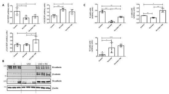 At the protein levels, we found similar results (Figure 1B); the expression of E-cadherin decreased in VAD lungs compared to controls, whereas the expression of N-cadherin increased in VAD (Figure 1B,C for quantification). Treatment of deficient rats with RA (VAD + RA) increased E-cadherin and β-catenin protein levels compared to the VAD group.
