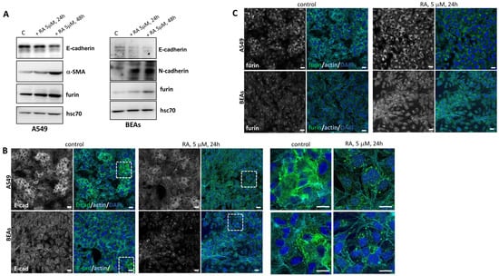 Effect of RA addition in vitro in human lung cell lines. (A) Western blot analysis showed the expression of different EMT markers and furin in two cell lines (A549 and BEAs) after incubation with 5 μM RA at 24 h and 48 h. Hsc70 was used as a loading control. A representative image is shown (n = 3 independent cultures). (B) Localization of E-cadherin (green), detected by immunofluorescence staining in A549 and BEA cells after 5 μM RA treatment for 24 h. Zoom has been made around the dotted lines and magnified images are shown on the right side. (C) Representative IF analysis of furin (green) in lung cell lines (A549 and BEAs) after 24 h of RA incubation (5 μM). In both (B,C), nuclei were stained with DAPI and F-actin with phalloidin (cyan blue). Scale bars 20 μM and 60 μM for zoom images in (B).