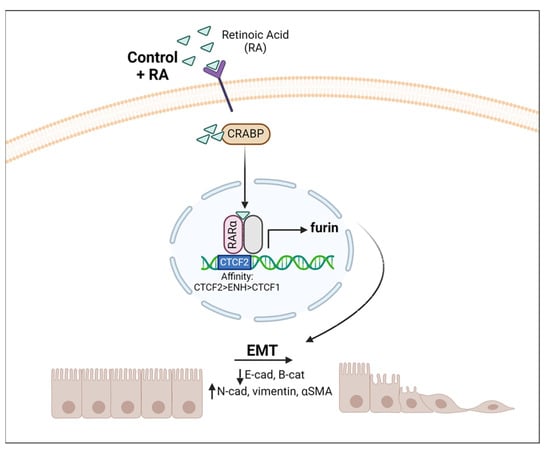 In conclusion, our study shows that vitamin A status modulates EMT as well as furin expression in the lung. Furin levels seem to follow the same pattern as the EMT markers analyzed in this article, i.e., furin levels increase with vitamin A deficiency in vivo, but also with RA addition in vivo and in vitro. This is in accordance with the role of furin in proteolytic activation of TFG-β, a key regulator of EMT [,,,]. The performed ChIP assay suggests that this modulation can be, in part, produced by the direct control exerted by RA on furin expression (Figure 6).