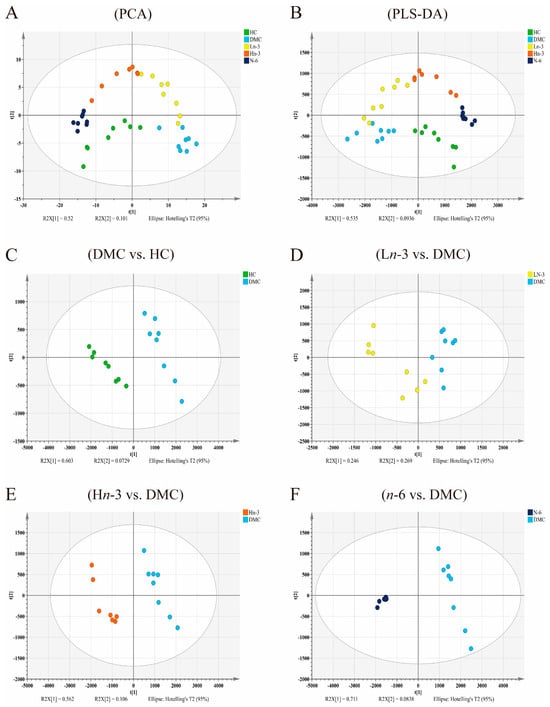 Score plots of PCA and PLS-DA of five groups (A,B) and score scatter plots of the PLS-DA model for pairwise comparison between groups (C–F). n = 8 for HC, DMC, Ln-3, and n-6 groups, n = 7 for Hn-3 group. HC, healthy mice + normal diet (AIN-93G); DMC, diabetic mice + normal diet; Ln-3, diabetes + diet of low-dose n-3 PUFA; Hn-3, diabetes + diet of high-dose n-3 PUFA; n-6, diabetes + diet of n-6 PUFA. PCA, principal component analysis; PLS-DA, partial least-squares discriminant analysis.