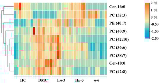 A total of 219 differential metabolites were identified between the HC and DMC groups. Among these, the relative peak intensities of 44 metabolites were significantly different between the treatment groups and the DMC group. Of these 44 metabolites, nine were matched with databases (HMDB, MyCompoundID, and LIPID MAPS) (mass tolerance ≤ 0.05 Da), including seven glycerophospholipids and two sphingolipids. Their heatmap is shown in Figure 3. Among these nine differential metabolites, two (PC (32:3) and Cer-16:0) were significantly lower, and seven (PC (36:6), PC (38:7), PC (40:9), PC (42:8), PC (42:10), PE (40:7), and Cer-18:0) were significantly higher in the DMC group than in the HC group (p < 0.05) (Table 2). PC (32:3) was significantly higher in the Ln-3, Hn-3, and n-6 groups than in the DMC group (p < 0.05). PC (36:6), PC (38:7), and PE (40:7) were significantly lower in the n-6 group than in the DMC group (p < 0.001). PC (40:9) and Cer-18:0 were significantly lower in the Ln-3, Hn-3, and n-6 groups than in the DMC group (p < 0.05). PC (42:8) and PC (42:10) were significantly lower in the Hn-3 and n-6 groups than in the DMC group (p < 0.001). Cer-16:0 was significantly higher in the Hn-3 group than in the DMC group (p < 0.001). Compared with the n-6 group, the Hn-3 group had higher levels of Cer-16:0, PC (36:6), PC (38:7), and PE (40:7) (p < 0.05).