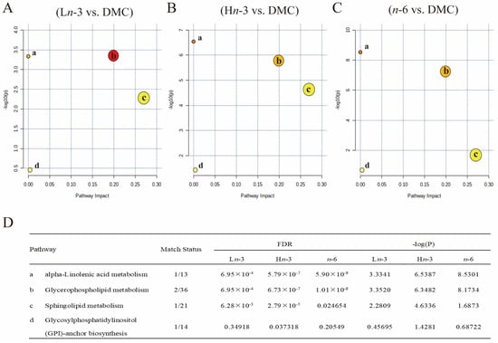 Pathway analysis of differentially altered embryonic metabolites. n = 8 for HC, DMC, Ln-3, and n-6 groups, n = 7 for Hn-3 group. HC, healthy mice + normal diet (AIN-93G); DMC, diabetic mice + normal diet; Ln-3, diabetes + diet of low-dose n-3 PUFA; Hn-3, diabetes + diet of high-dose n-3 PUFA; n-6, diabetes + diet of n-6 PUFA. FDR, false discovery rate. (A–C), pathway analysis for Ln-3 vs. DMC (A), Hn-3 vs. DMC (B), and n-6 vs. DMC (C). (D) FDR and -log(P) for pathways. a–d in (A–C) indicated the main affected pathways, and their names were shown in (D). Different colors in (A–C) indicated different levels of significance, and a deeper color indicated a greater -log(P) value.