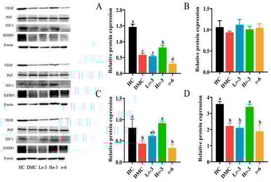 As shown in Figure 6, the levels of VEGF, IGF-1, and IGFBP3 proteins in the DMC group were lower than in the HC group (p < 0.05) and were comparable with the Ln-3 group (p > 0.05). The levels of VEGF, IGF-1, and IGFBP3 in the Hn-3 group were higher than in the DMC group (p < 0.05). Compared with the DMC group, the n-6 group had a significantly lower level of VEGF (p < 0.05) and comparable levels of IGF-1 and IGFBP3 (p > 0.05). No significant group difference was observed for PGF protein levels (p > 0.05).