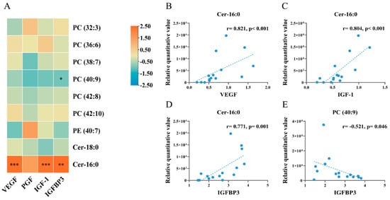 Correlation analysis of differentially altered embryonic metabolites with protein levels of placental growth factors (n = 15). (A) heat map for correlation analysis; (B,C), scatter plots showing the correlations between Cer-16:0 and VEGF (B), between Cer-16:0 and IGF-1 (C), between Cer-16:0 and IGFBP3 (D), between PC (40:9) and IGFBP3 (E). In scatter plots, each dot indicated a sample, and the dashed line indicated the linear fit line. Spearman correlation coefficients were calculated for the relationships between metabolites and placental protein levels. * p < 0.05; ** p < 0.01; *** p < 0.001.