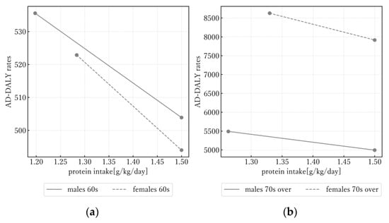The present results show different relations between protein intake and AD-DALY rate among sex or age groups. One reason for this difference might be caused by the prevalence of AD by sex and age. According to the Patient Survey in 2020 in Japan [31], the numbers of male patients with AD were 8 thousand and 211 thousand for individuals in their 60s and aged over 70, respectively. In females, these were 11 thousand and 562 thousand for individuals in their 60s and aged over 70, respectively. This means that females over 70 years old are more likely to have AD. In addition, the average intake of total protein and plant protein per body weight per day is greater in females than in males. The simulation of increased animal and plant protein with AD-DALY rates might differ because of the actual intake. There may be a specific, appropriate balance of animal and plant protein; however, we were not able to determine it in the present study.