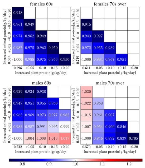 Figure 2 shows the simulation results of AD-DALY rates using Model II when animal and plant protein intake was varied. We explored situations in which animal and plant protein increased by 0.05 g/kg/day from the actual intake in 2019. When the total of animal and plant protein intake exceeded 1.5 g/kg/day, boxes are shown as blank. The values in the heatmap denote relative ratios () when AD-DALY rates in 2019 are set to 1.
