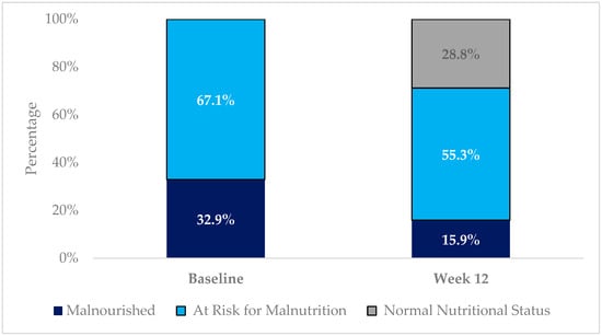 Changes in the subjects’ nutritional status from baseline to week 12, assessed with the Mini Nutritional Assessment tool.
