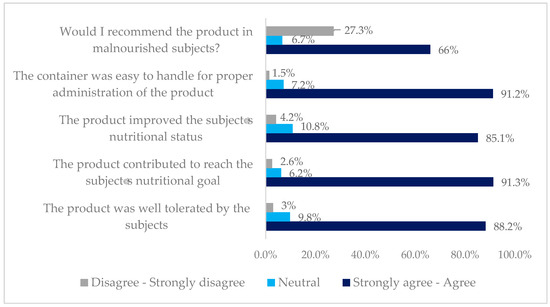 The healthcare satisfaction questionnaire contains 5 items (product tolerability, ability of the subject to meet their nutritional goals, nutritional status improvement, ease of use, and product recommendation) assessed using a 5-point Likert scale ranging from strongly agree to strongly disagree; one item (ability to achieve product recommendation) assessed using a 5-point evaluation scale (1 = 0%, 2 = 25%, 3 = 50%, 4 = 75%, and 5 = 100%); one item (dose reduction due to tolerability) assessed using a 3-point evaluation scale (1 = rarely, 2 = sometimes, and 3 = frequently); and one item (decision to continue with the product) assessed with a yes/no question [24]. The patient satisfaction questionnaire contains 4 items (taste, texture, tolerability, and general evaluation of the product) scored on a scale ranging from 1 to 10.