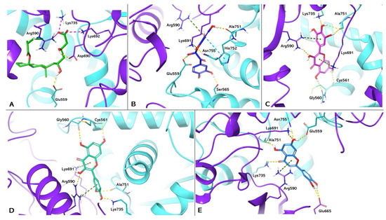 Molecular docking analysis. Three-dimensional representation of HGMCR complexed with mevastatin (A); benzofuranone (B); myricetin (C); quercetin (D); and luteolin (E) docked in the active site of HMGCR, respectively. HMGCR is shown as cartoon purple (Chain A) and cyan (Chain B). Mevastatin, benzofuranone, myricetin, quercetin, and luteolin are shown as light green, blue, magenta, dark green, and light blue carbon sticks, respectively. The amino acid residues involved in the interactions are shown as carbon sticks purple (Chain A) and cyan (Chain B), respectively. Hydrogen bonds, π-π, cation-π interactions, and salt bridges are shown as dashed lines, yellow, light blue, green, and magenta, respectively.