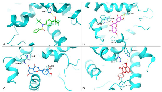 PDB 1UHL represents the crystallographic model of LXRα used in the study, in which the synthetic agonist T0901317 constitutes the co-crystallized ligand. Box A in Figure 3 shows the re-docking results for T0901317, highlighting the formation of a hydrogen bond with the His421 of LXRα. This interaction is in agreement with the data reported in the literature, which attribute to this bond a crucial role in LXRα activation [31]. Boxes B, C, and D show the docking of myricetin (ChemPLP Fitness score 55.083), luteolin (ChemPLP Fitness score 53.643), and kaempferol (ChemPLP Fitness score 51.474), respectively. These compounds exhibit hydrogen bonding to H421, reproducing the interaction observed in T0901317; they also exhibit hydrogen bonding to Trp443. Other protein–ligand interactions can increase ligand stability. For example, Thr302 and Phe254 form two and one hydrogen bonds with myricetin, respectively. In contrast, luteolin and kaempferol each form a π-π interaction with Phe326 and Phe257, respectively.