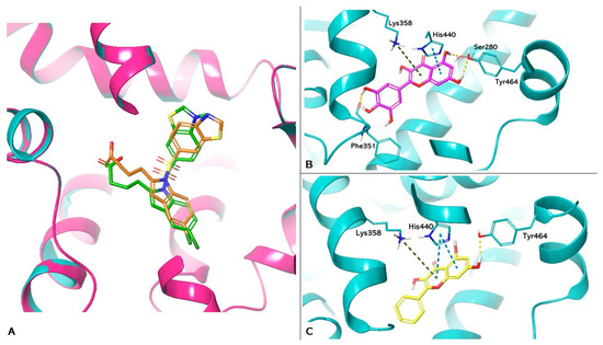 The PDB 8HUK represents the crystallographic model of PPARα used in the study, in which the lanifibranor agonist constitutes the co-crystallized ligand. Box A in Figure 4 shows the re-docking results for lanifibranor. By superimposition between the crystallographic model and the pose obtained by re-docking, it was observed that the agonist retains the correct position (Root Mean Square Deviation (RMSD) value: 1.871Å). Boxes B and C show the docking of myricetin (PLP Fitness score 65.655) and galangin (PLP Fitness score 60.412), respectively. These compounds exhibit hydrogen bonding to Tyr464, reproducing the interaction reported in the literature, responsible for PPARα activation [32]. In addition, both compounds form hydrophobic interactions with His440 and Lys358. In addition, myricetin has hydrogen bonds with Ser280 and Phe351. This interaction network increases the stability of ligands at the binding site.