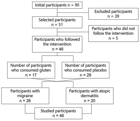 A randomized, double-blind, placebo-controlled clinical trial was designed to investigate the effect of gluten on gut microbiota composition and diversity, symptoms, intestinal permeability, and biomarkers in 46 participants with GIDs suffering from migraine (n = 26) and dermatitis (n = 20) who followed a gluten free diet, consuming 8 g of gluten or placebo in sachets daily for 6 weeks (Figure 1). The diet was administered by expert dietitians with semi-personalized and standardized menus and was normocaloric and based on a Mediterranean diet.