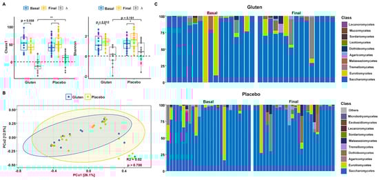 No changes in alpha diversity were observed in any case when comparing study times and groups. Both the Chao1 (n = 16, paired t-test, p = 0.148, Figure 3A) and Shannon (n = 16, paired t-test, p = 0.568) indices revealed no significant results in the gluten and placebo groups after the intervention (Chao1: n = 27, paired t-test, p = 0.742; Shannon: n = 27, sign test, p = 0.424). PERMANOVA also could not detect differential spatial distributions of fungal communities between groups (p > 0.700; Figure 3B).