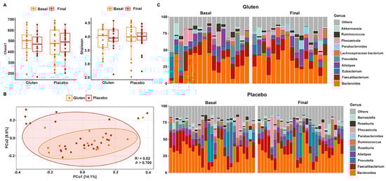 Gut bacterial diversity and composition of participants according to study group. (A) Chao1 (left) and Shannon (right) alpha diversity indices in the gluten (n = 16) and placebo (n = 27) groups. (B) PCoA based on the Bray–Curtis distance. (C) Relative abundance of 10 dominant bacterial genera in the gluten (top) and placebo (bottom) groups according to basal and final time.