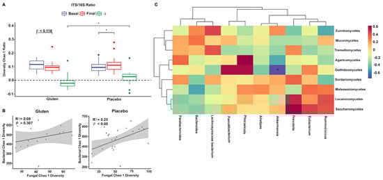 Relationship between fungi and bacteria after the intervention. (A) Internal transcribed spacer (ITS)/16S ratio of Chao1 richness index. (B) Linear regression of fungal and bacterial Chao1 diversity indices in the gluten (left, n = 15) and placebo (right, n = 24) groups. (C) Hierarchical clustering of correlations using the Spearman’s test between bacterial genera (bottom) and fungal classes (right side) in the gluten group. ∆ = Final − Basal. * p < 0.05 (ITS/16S), * false discovery rate < 0.05 (heatmap).