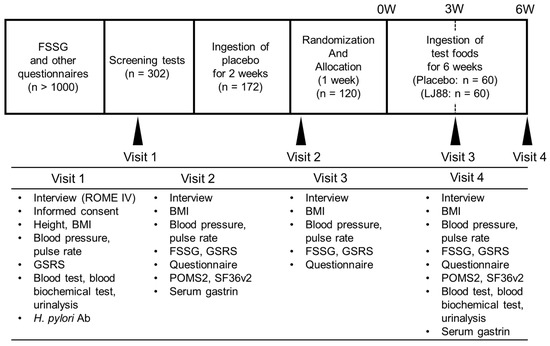 Time schedule of the study and the test items at each visit. Abbreviations used: ROME IV, ROME IV diagnostic criteria for functional dyspepsia; BMI, body mass index; GSRS, Gastrointestinal Symptoms Rating Scale; Ab, antibody; FSSG, Frequency Scale for the Symptoms of Gastroesophageal Reflux Disease; POMS2, Profile of Mood States, second edition; SF36v2, 36-item Short-Form Health Survey v2.