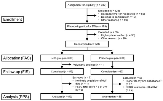 The ingestion of the test foods was divided into two periods (Figure 1). The first period started after the screening tests, in which all participants were instructed to ingest the placebo food once a day for two weeks. By using this ‘placebo-ingestion period’, we selected more appropriate participants (n = 120) with lower placebo effect and higher compliance to the instructions. The selected 120 participants were divided into placebo or LJ88 groups and instructed to ingest either placebo food or test food containing heat-killed LJ88 (1 billion cells/day), daily, for 6 weeks. The test items at each visit are summarized in Figure 1. Randomization was performed by a controller (Tsurumi University, Kanagawa, Japan) with a stratified block randomization method using ‘Frequency Scale for the Symptoms of Gastroesophageal Reflux Disease’ (FSSG), ‘Gastrointestinal Symptoms Rating Scale’ (GSRS), age, and sex as allocation adjustment factors. The controller assigned the two groups (placebo and LJ88 groups). The allocation table had been sealed by the controller and kept sealed until the allocation table was to be opened after the termination of all data collection. A flow diagram of the study is shown in Figure 2.