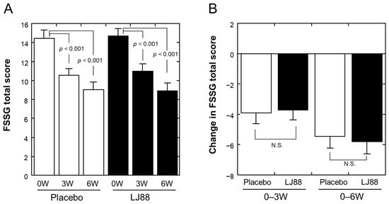(A) FSSG total score at 0 (baseline), 3, and 6 weeks of ingestion of test foods. (B) Change in FSSG total score from 0 to 3 weeks (0–3 W) and 0 to 6 weeks (0–6 W). Open and closed bars represent placebo and LJ88 groups, respectively. Means with standard errors are plotted. The significant probabilities are shown in the Figures, and N.S. denotes “not significant”.
