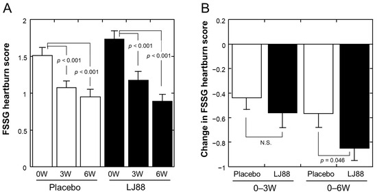 Table 2 summarizes the effects of test foods on FSSG scores (n = 55 and 52 for the placebo and LJ88 groups, respectively; per protocol set, PPS). The total score, sub-scores for acid reflux-related and dyspeptic symptoms, and almost all specific scores of the FSSG questionnaire were significantly improved at 3 and 6 W compared to baseline (0 W) in both groups. The changes in total and heartburn scores are depicted in Figure 3A and Figure 4A, respectively, as well. The FSSG score for the item “1. Do you get heartburn?” was significantly improved at 6 W in the LJ88 group compared to the placebo group (p = 0.046; Figure 4B), whereas total score (Figure 3B) and other specific and sub-scores did not (Table 2). Conversion of the FSSG data to relief rates between 0 and 6 W (Table 3) indicated a significantly higher relief rate in the LJ88 group than in the placebo group (p = 0.049).