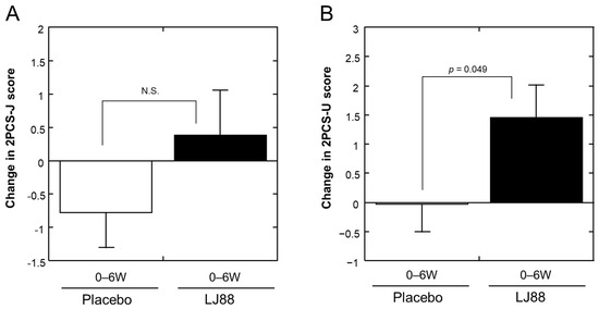 Changes from 0 to 6 weeks (0–6 W) in (A) physical component summary Japanese version (two components; 2PCS-J) and (B) physical component summary universal version (two components; 2PCS-U) of SF-36v2 scores. Open and closed bars represent placebo and LJ88 groups, respectively. Means with standard errors are plotted. The significant probabilities are shown in the Figures, and N.S. denotes “not significant”.