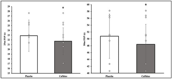 The paired sample t-test revealed a significant difference in CAF and PLA conditions. The freestyle swimming speed was significantly improved in 25 m FSP (22.8 ± 3.2 vs. 21.7 ± 2.8, p = 0.032, d = 0.37, Figure 2) and 50 m FSP (50.7 ± 6.4 vs. 48.4 ± 5.8, p = 0.033, d = 0.38, Figure 2).