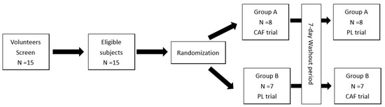 A double-blind, repeated-measure crossover design was employed to investigate the effects of caffeine on basketball performance (Figure 1). The participants were randomly assigned to chew either a 3 mg/kg caffeinated gum (CAF) or a placebo gum (PL), followed by a seven-day washout period before crossing over to the other trial. Prior to the formal experiment, all the participants completed one or two familiarization tests to ensure proper test execution. Free throw accuracy was designated as the primary outcome measure, and the secondary outcomes were basketball-specific physiological tests. This study was conducted from 29 May 2023 to 8 September 2023. This is the out-of-season training period for players.