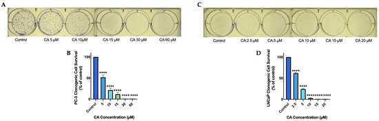 PC-3 prostate cancer cells were treated with 5, 10, 15, 30, or 60 µM of CA and the ability of cells to survive and form colonies was examined by performing a clonogenic survival assay [53]. Carnosic acid dose-dependently decreased cell survival. A significant (p < 0.0001) decrease in cell survival was seen at a concentration as low as 5 µM and complete inhibition of cell survival was seen at and above 30 µM (CA 5 µM: 51.6 ± 5.5%, p < 0.0001; CA 10 µM: 21.3 ± 4.9%, p < 0.0001; CA 15 µM: 11.6 ± 4.5% of control, p < 0.0001; Figure 1B). In addition, we used LNCaP prostate cancer cells and treated them with 2.5, 5, 10, 15, or 20 µM of CA. We found a dose-dependent decrease in cell survival with significant inhibition seen at a concentration as low as 2.5 µM and complete inhibition seen at 15 µM. (CA 2.5 µM: 61.9 ± 1.9%, p < 0.0001; CA 5 µM: 24.2 ± 1.9%, p < 0.0001; CA 10 µM: 2.8 ± 1.0% of control, p < 0.0001; Figure 1D).