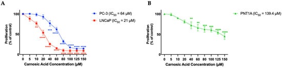 PNT1A cells, which represent normal prostate epithelium were treated with the same concentrations of CA for 24 h and found an inhibitory effect with an IC50 of 139.4 µM (Figure 2B), a much higher concentration compared to the IC50 for PC-3 and LNCaP prostate cancer cells.