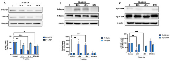 mTOR and p70 S6K the downstream targets of Akt were also examined as they are key players in protein synthesis and cell proliferation signalling. Cells treated with CA showed a significant decrease in mTOR phosphorylation/activation (CA 24 h: 45.5 ± 10.3%, p < 0.01; CA 48 h: 32.0 ± 7.8% of control, p < 0.001; Figure 4A). The mTORC1 complex consists of mTOR and the regulatory protein, raptor, allowing it to interact with downstream targets [65]. Cells treated with CA showed a significant increase in raptor phosphorylation (CA 24 h: 617.7 ± 146.5%, p < 0.01; CA 48 h: 544.0 ± 106.2% of control, p < 0.01; Figure 4B). A decrease in p70 S6K phosphorylation/activation was also seen (CA 24 h: 24.9 ± 23.3%, p < 0.01; CA 48 h: 2.1 ± 1.2% of control, p < 0.001; Figure 4C).