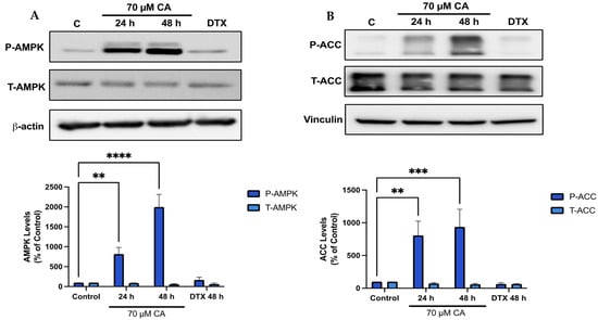 Previous studies by our group found a robust phosphorylation/activation of AMPK by CA in muscle [66], fat [67] and lung cancer cells [57] and since AMPK plays a key role in energy homeostasis [68] and its activation may lead to anticancer effects [69,70], we examined the effects of CA on prostate cancer cell AMPK and its downstream target ACC. Treatment of PC-3 cells with CA significantly increased AMPK phosphorylation/activation (CA 24 h: 816.2 ± 167.0%, p < 0.01; CA 48 h: 1997.9 ± 314.9% of control, p < 0.0001; Figure 5A) and phosphorylation of ACC (CA 24 h: 806.7 ± 217.8%, p < 0.01; CA 48 h: 936.3 ± 269.3% of control, p < 0.001; Figure 5B).