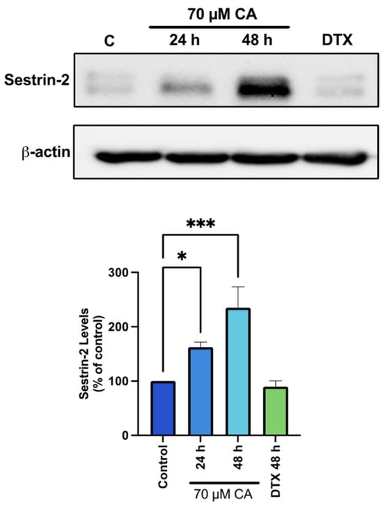 In an attempt to understand the mechanism of AMPK activation by CA, we examined sestrin-2 which is known to have a direct effect of activating AMPK [71,72]. We found a significant increase in sestrin-2 levels with CA (CA 24 h: 162.7 ± 9.2%, p < 0.05; CA 48 h: 236.3 ± 38.27% of control, p < 0.001; Figure 6), whereas treatment with DTX had no effect on in Sestrin-2 levels.
