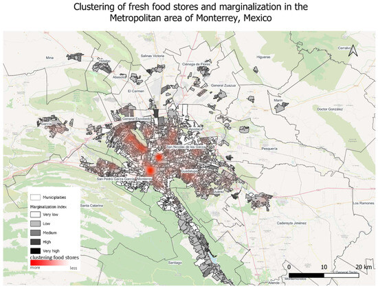 We found that in the metropolitan area of Monterrey, outlets that sell fresh food are mostly clustered in the central urban areas such as the municipalities of Monterrey, San Nicolás de los Garza, General Escobedo, and San Pedro Garca García (Figure 2). The suburban municipalities of Apodaca and Guadalupe also seem to have smaller clusters of fresh food outlets; however, the presence of such outlets diminishes with distance from the urban center. The peripheral municipalities where fresh food outlets are lacking seem to be the ones with a higher degree of poverty and marginalization, such as García, El Carmen, General Zuazua, Santa Catarina, and Santiago. This indicates a fragile context in the metropolitan periphery of Monterrey that can fuel further food access insecurity.