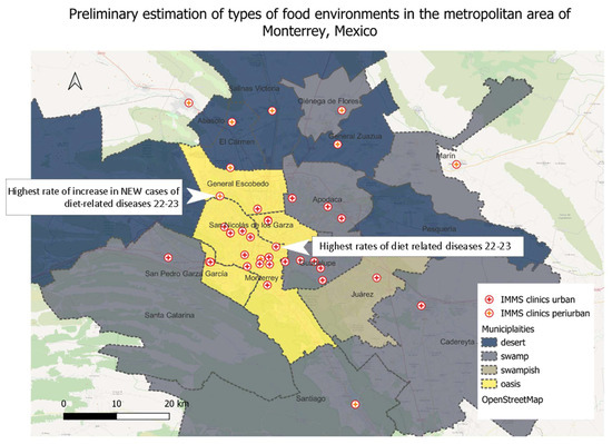 In Figure 3, we map the food deserts in Monterrey, which are predominantly found in the peripheral municipalities in the north, while the food swamps are in the suburban and periurban municipalities of the south. The food oases are grouped in the central and most dense area of Monterrey. Concerning diet-related diseases and food environments, we found that the clinic that reported the highest incidence of diet-related diseases in the period 2022–2023 is in the municipality of Monterrey, close to the border with Guadalupe, which is a food swamp. We previously categorized the municipality of Monterrey as a food oasis since many fresh food outlets are located there and the accessibility is high. Nevertheless, we also noted that there is a significant number of processed food stores as well and these are surrounded by food swamps. Thus, the reason might be circumstantial or cultural—one of choice. The limited local production of food in that municipality or lack of recreational facilities might be contributing factors as well. Thus, the relationship between the food environment and diet-related diseases is not straightforward and needs more contextual research. However, the clinic that reported the highest rise in cases of diet-related diseases is found in the transition area between Monterrey and General Escobedo, which indicates that the hot-spot of diet-related diseases is moving to the north of the metropolitan area where food deserts prevail. This could be an additional risk for the northern municipalities that already have high poverty rates and drought risks.