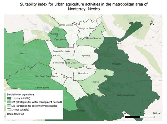 Furthermore, we reviewed the suitability of areas for agricultural activity. We first estimated the area of each municipality that was unbuilt and had less than a 20% slope, the type of soil that predominated, and the annual rainfall in two periods: dry season November–April and wet season May–September. The unbuilt area was calculated as a rough estimate; from the total municipal area we extracted all built areas consisting of communication and infrastructure, housing, and other functional land uses. Since there is no precise data about communication or other services and facilities, we estimated 30% of the total area for communication and infrastructure. For services and facilities, we estimated an area equal to the housing area, based on the mixed-use planning tool proposed by van den Hoek in 2008 [39]. Most municipalities have underdeveloped services, communication and infrastructure systems, and housing predominates, thus our estimate was the most conservative scenario leaving aside sufficient space for a desirable urban structure where mix-use and accessibility would be significantly improved. Based on data available on the open interactive platform for hydrological research SIATL from INEGI [40], we revised dominant soil type and annual rainfall in each municipality. Thus, we estimated which municipalities had better conditions in terms of cultivation area per citizen, soil type for cultivation, and water availability, and assigned an index of suitability for urban agriculture as follows: